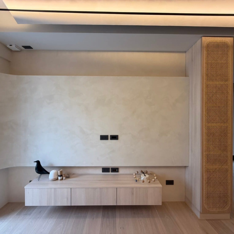 實務上,多數新北案件會以「電視櫃系統櫃為主,局部木工修飾」的方式,兼顧實用與美感。